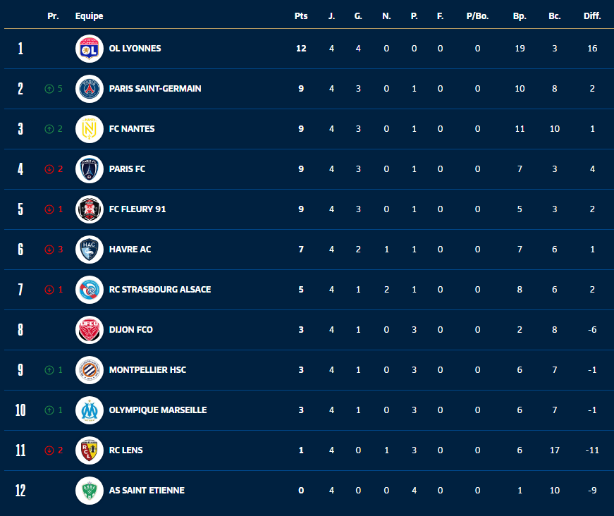 Le classement tient compte du retrait d’un point initialement obtenu par Lens face au PSG, entériné mercredi par la Commission fédérale des règlements et contentieux de la FFF