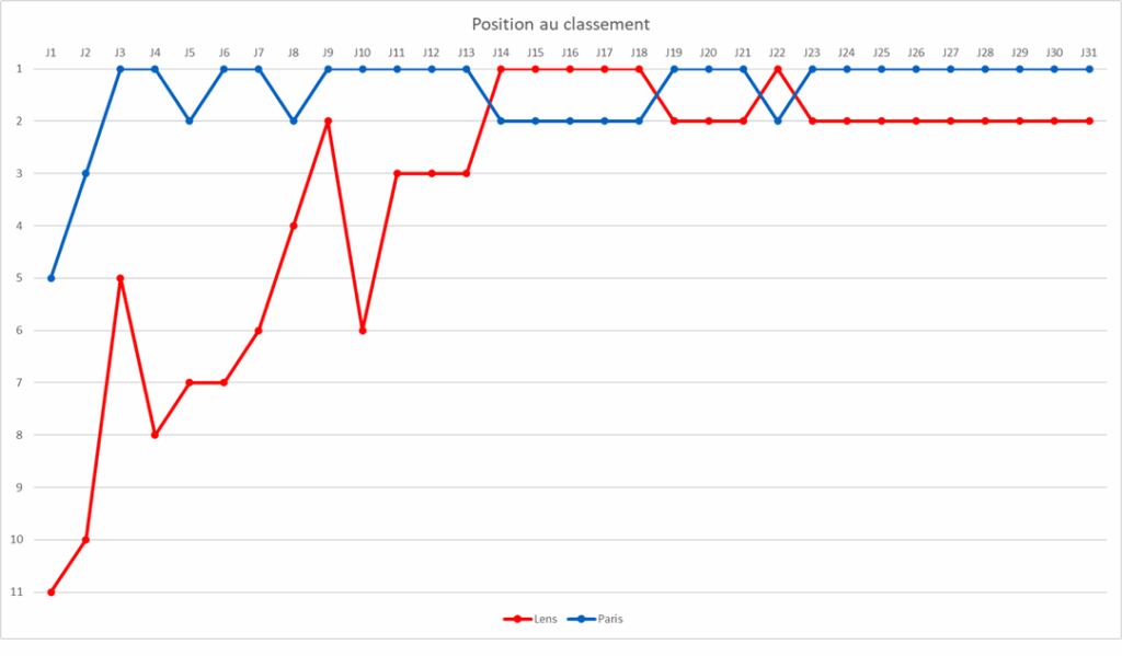 En rouge, la progression de Lens ; en bleu, celle du Paris Saint-Germain
